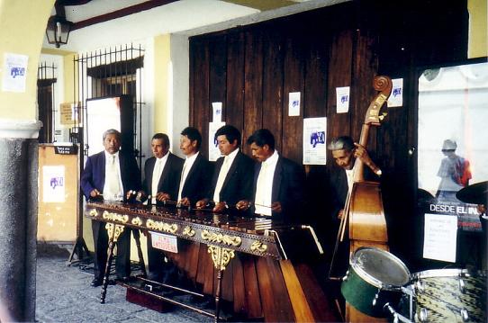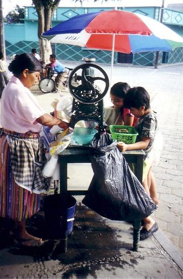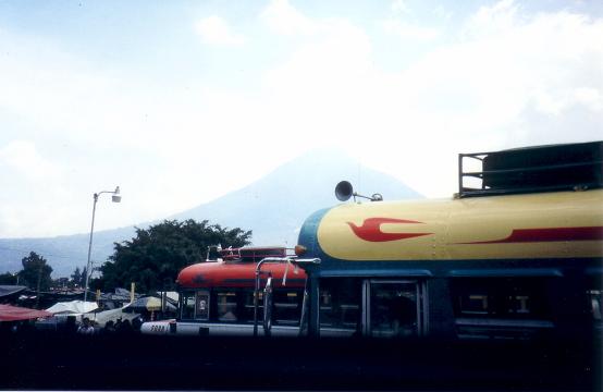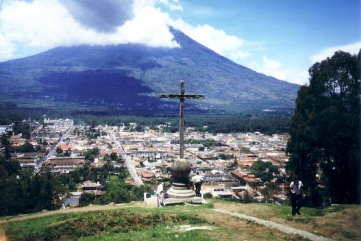 in und um Antigua"Cruz": Blick über Antigua mit Vulkan Agua, typische Busse Strassen-Ansichten: Marimba-Gruppe, San Francisco, La Merced, Ceviches, Park "Eismaschine", Mangostand, Weberin