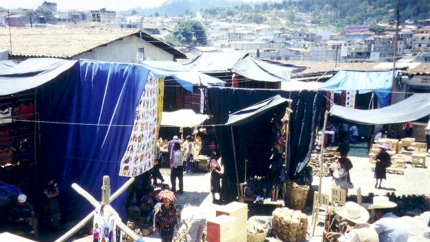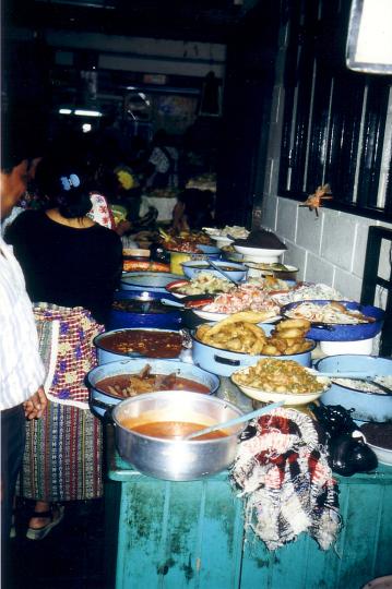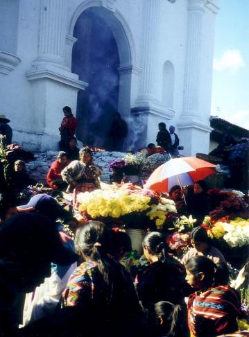 Markt in ChichicastenangoWeihrauchverbrennung und Marktstände in Chichicastenango leckeres Essen und frisch gepresster Orangensaft (aus Plastiktütchen)